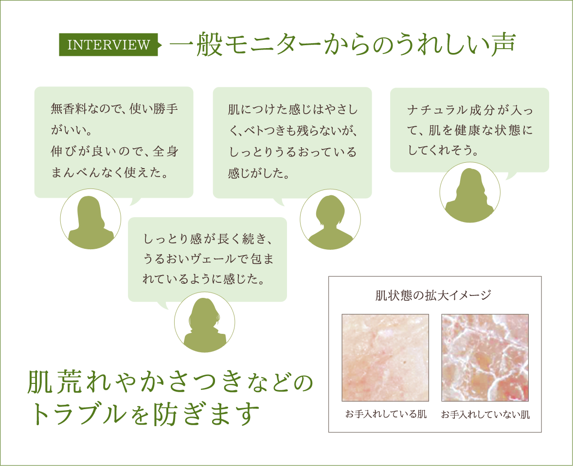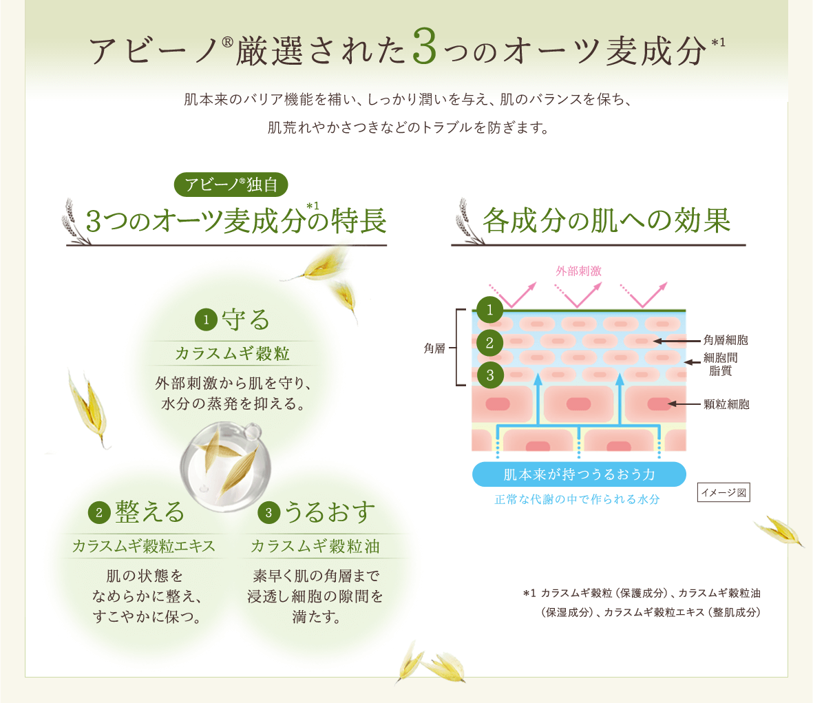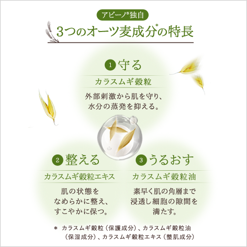 商品紹介 | 皮膚科学の視点から、厳選された 3 つのオーツ麦 *1を独自配合。肌本来のバリア機能を補い、潤い を与え、肌のバランスを保ち、肌荒れやかさつきな どのトラブルを防ぎます。 ●無香料、無着色、パラベンフリー、エタノールフリー *1 カラスムギ穀粒(保護成分)、カラスムギ穀粒油(保湿成分)、カラスムギ穀粒エキス(整肌成分) |